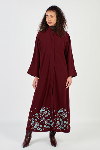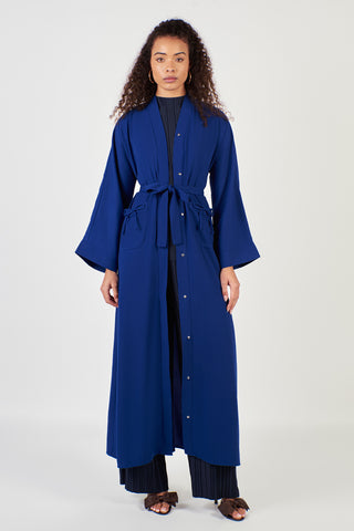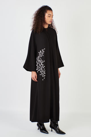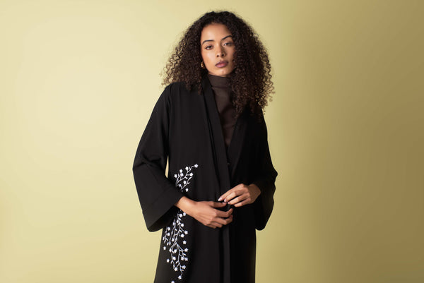 LCCH23154J_XS-SThis black abaya features contrast pink piping along the seam, and a matching belt to complete the look. Also available in Lilac, Brown and Beige.